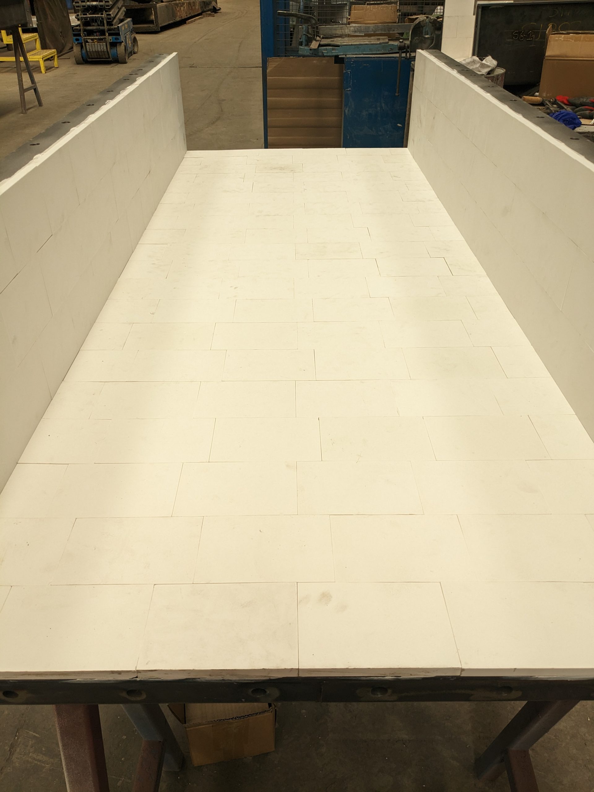 Replacement chute sections were manufactured and lined at Kingfisher’s facility. The image shows the lower, high-wear section fully lined with K-ALOX ceramic tiles, designed for long-term abrasion resistance.