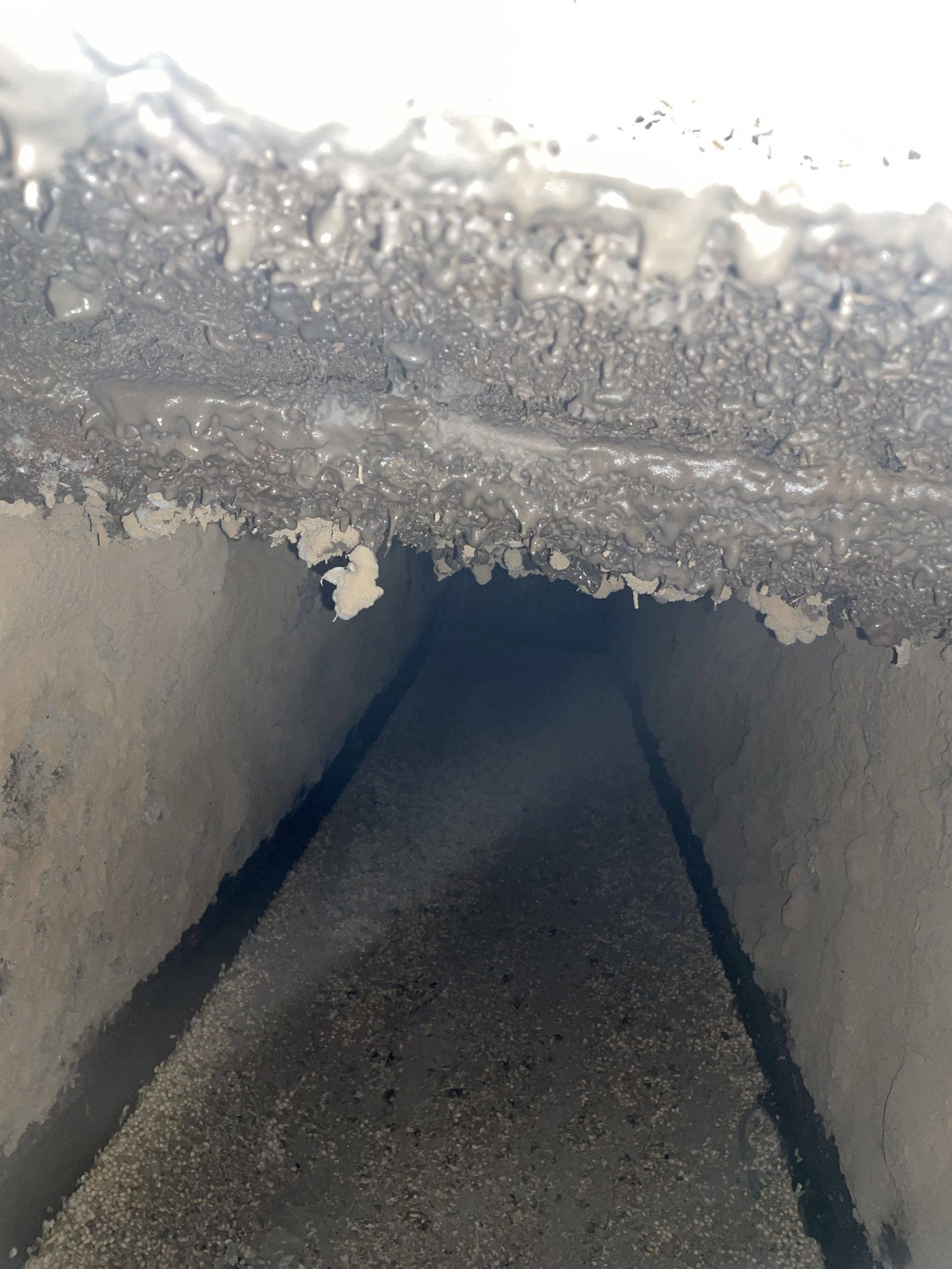 Inspection revealed significant material build-up on the roof, side walls and base of the chute. The liner surface had degraded and become rough, directly contributing to adhesion and blockage formation.